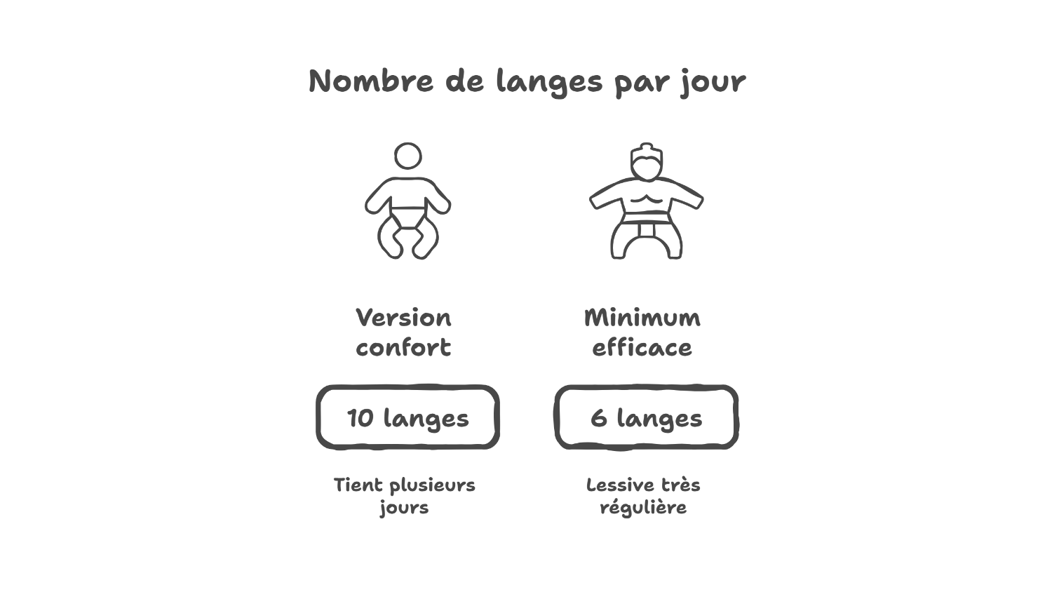 - 10 langes : c’est la version confort. Vous tenez plusieurs jours, même avec un bébé qui régurgite beaucoup ou des journées très “collées-serrées”.