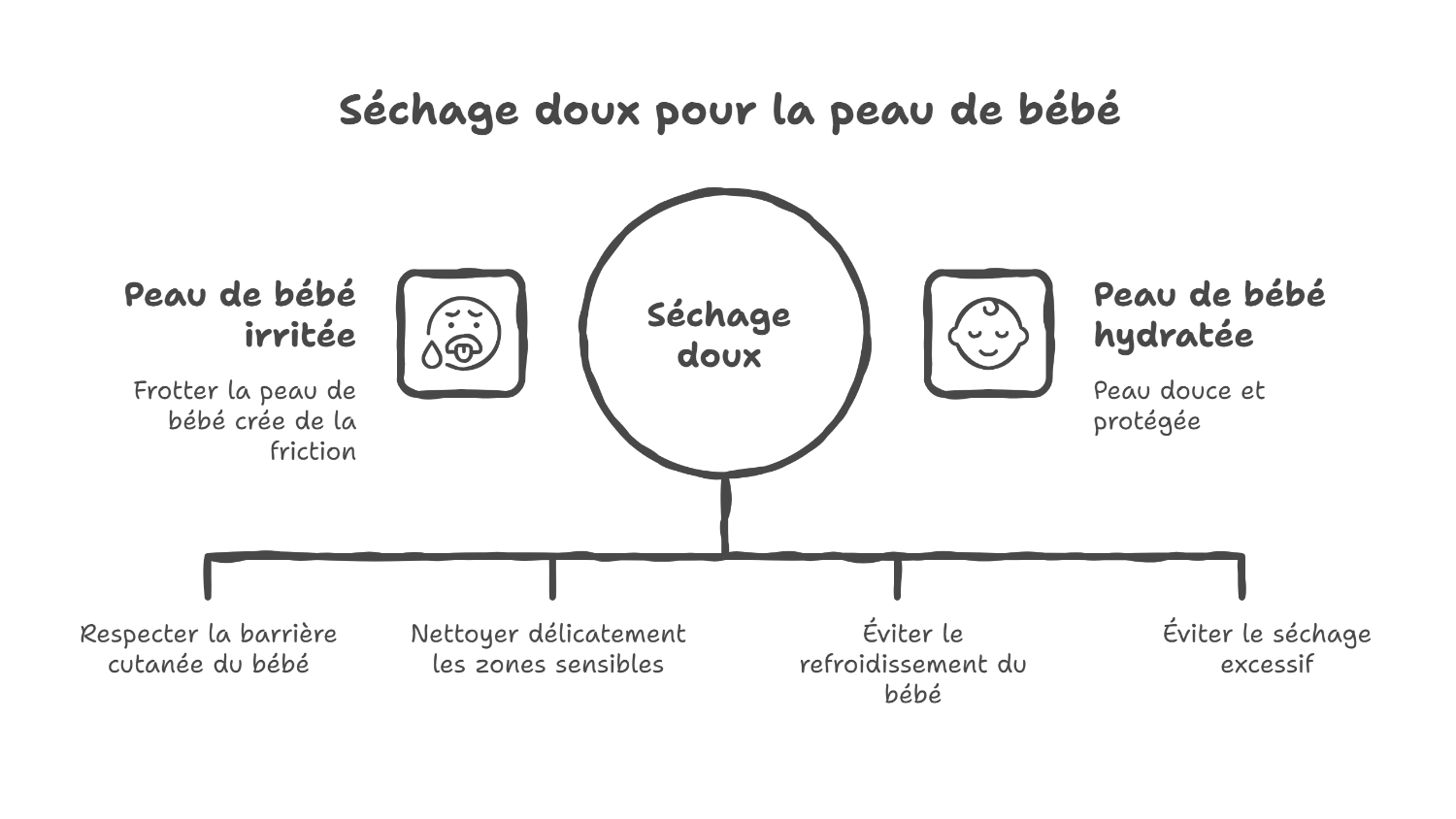 Vous vous demandez si la peau doit être parfaitement sèche ? Non. L’objectif, c’est d’éviter l’eau qui stagne, tout en profitant d’une légère humidité pour mieux hydrater la peau de bébé après le bain.