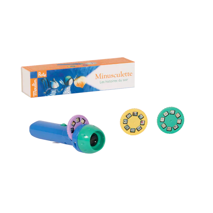 Lampe torche de poche où chacun des 3 disques projetés sur le mur raconte les aventures de Minusculette, une petite héroïne féérique de l'école des loisirs. Pour endormir les tout-petits et développer leur imagination !
